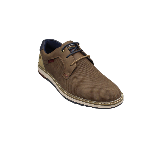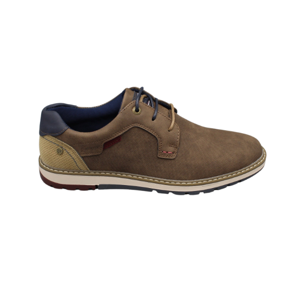 Zapato de caballero estilo casual con cordones LIBERTO. Fabricado en napa sintética color taupe con pieza marino en el talón. Suela de goma con vira.