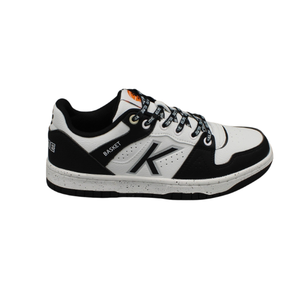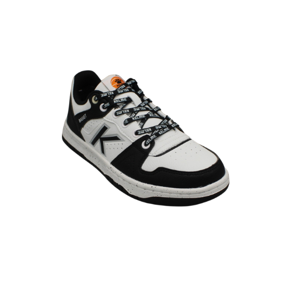 Zapato deportivo de hombre KELME estilo retro. Fabricado en napa sintética color negro combinado con blanco. Suela de caucho muy flexible.