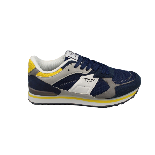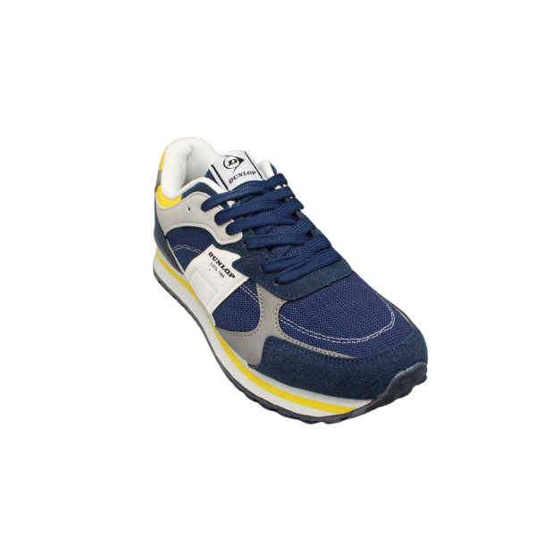 Zapato de hombre estilo deportivo DUNLOP con cordones. Fabricado tejido combinado color azul y suela blanca con raya amarilla