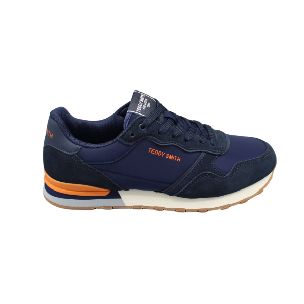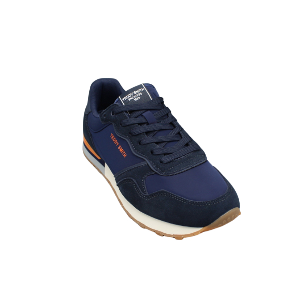 Zapato de hombre estilo casual TEDDY SMITH con cordones. Fabricado en napa sintética combinado con nylon color azul. Suela combi con pieza naranja en el talón.