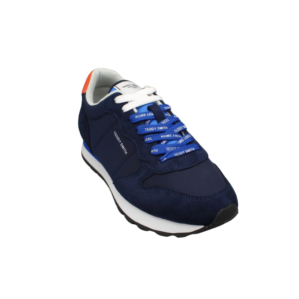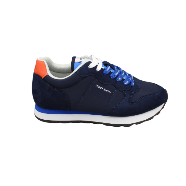 Zapato de hombre estilo casual TEDDY SMITH con cordones. Fabricado en napa sintética combinado con nylon color azul y pieza roja en el talón.
