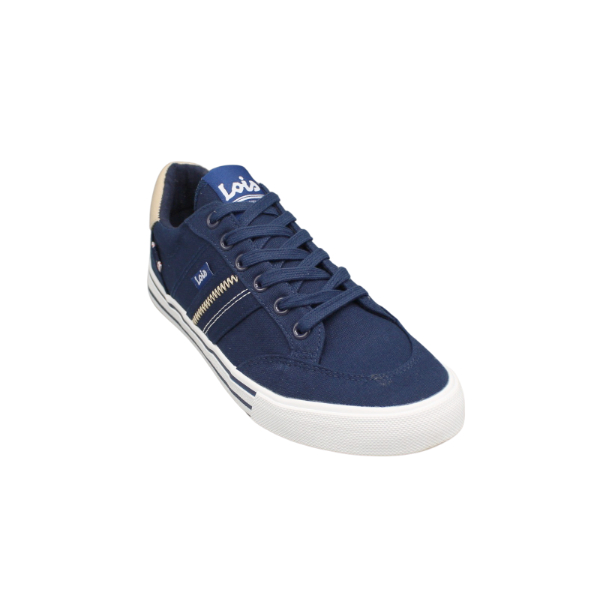 Zapatilla de hombre LOIS con cordones. Suela de goma blanca con rayas azules. Fabricado en lona color azul.