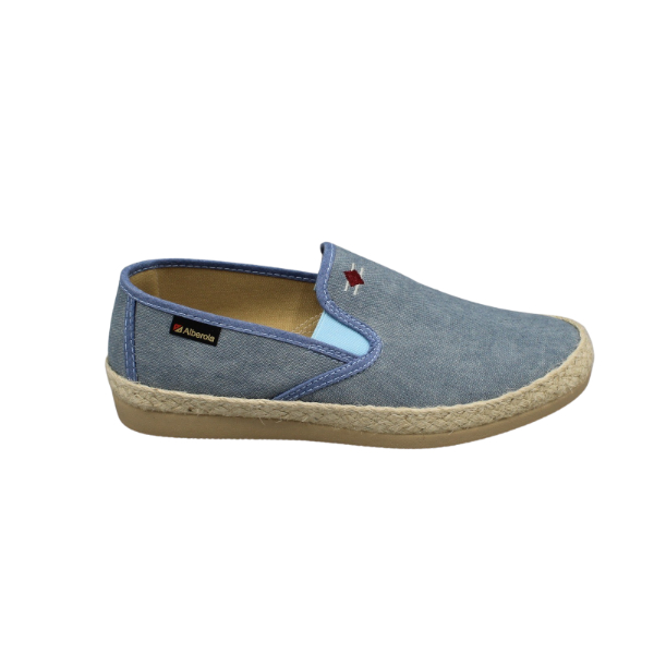 Alpargata de hombre fabricada en tejido color jeans con bordado lateral. Suela de goma con vira de yute.