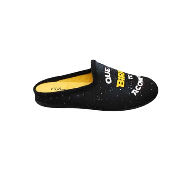 Chinela de casa de hombre tipo twin con estampado “QUE LA BIRRA TE ACOMPAÑE” Fabricada en bamara color negro con plantilla extraíble amarilla. Suela de goma.