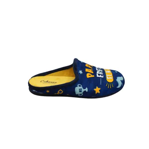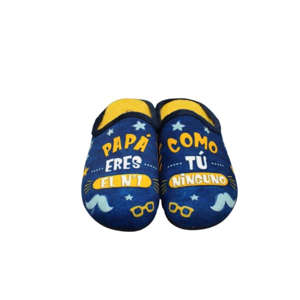 Chinela de casa de hombre tipo twin con estampado “PAPÁ ERES EL Nº1, COMO TÚ NINGUNO”. Fabricado en bamara color azul. Plantilla extraíble y suela de goma para una mayor comodidad.