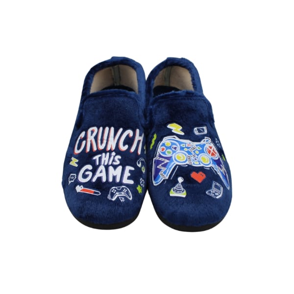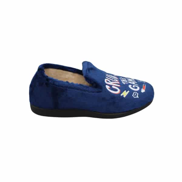 Zapatilla de casa de hombre tipo twin con estampado mando de consola. Fabricado en suapel color azul. Plantilla extraíble y suela de goma para una mayor comodidad.