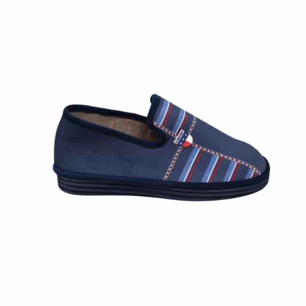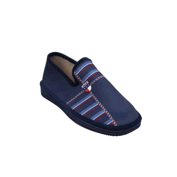 Zapatilla de casa de hombre con estampado piezas rayas. Fabricado en bamara marino. Suela ligera y confortable.