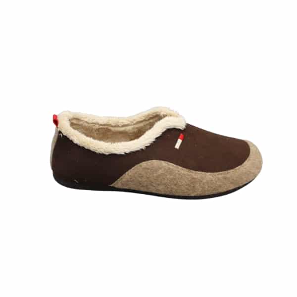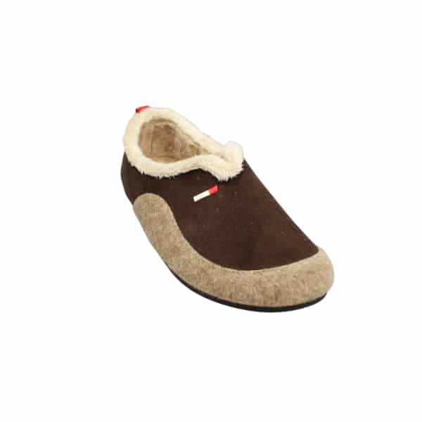 Zapatilla de casa cerrada de hombre combinada en bamara marrón con pieza beige y con apertura en el empeine. Plantilla extraíble y suela de goma para una mayor comodidad.