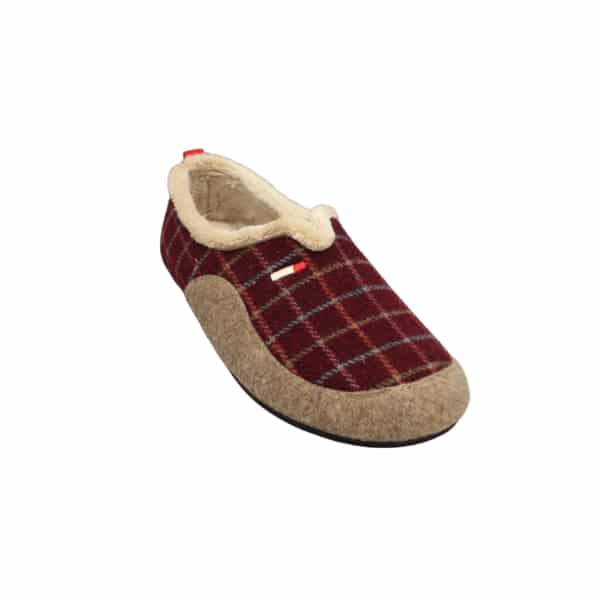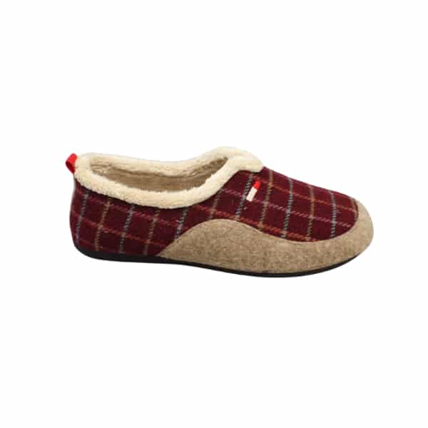 Zapatilla de casa cerrada de hombre combinada en tejido burdeos de cuadros con pieza beige y con apertura en el empeine. Plantilla extraíble y suela de goma para una mayor comodidad.