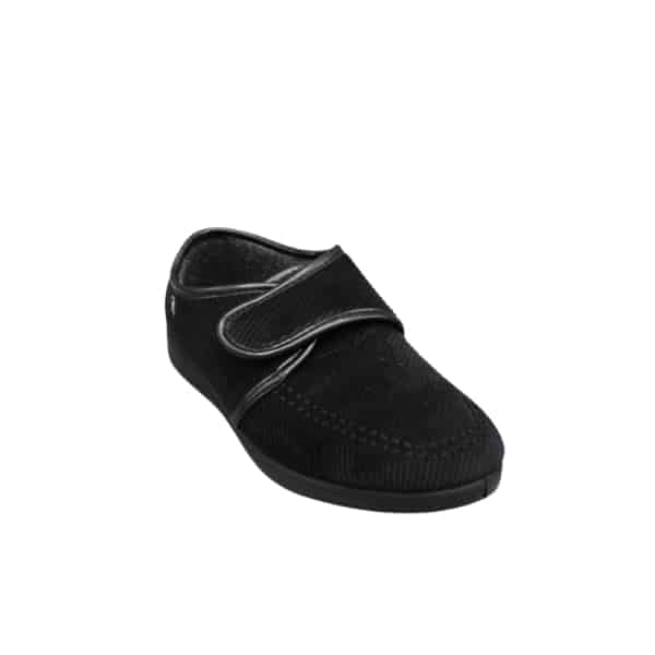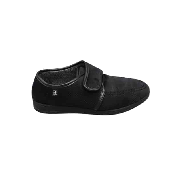 Zapato línea especial confort. Con cierre de velcro y tejido negro. Suela de goma para una mayor comodidad.
