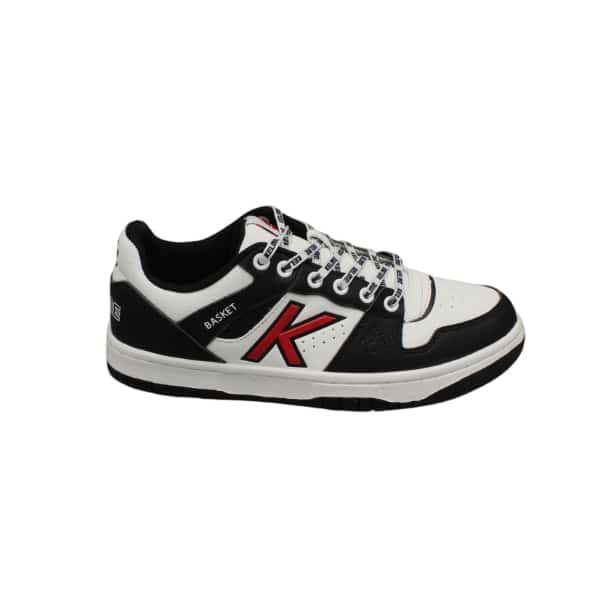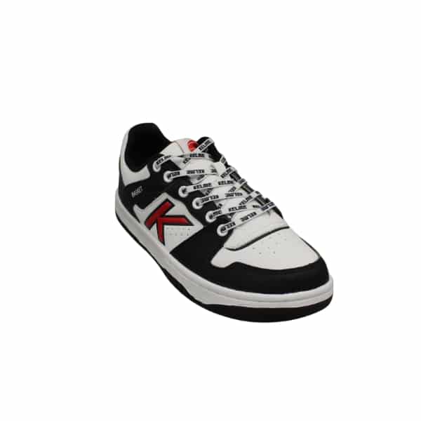 Zapato deportivo de hombre KELME estilo retro. Fabricado en napa sintética color blanco combinado con negro. Suela de caucho muy flexible.