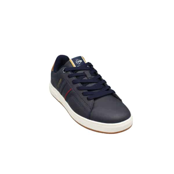 Zapato de hombre de DUNLOP con cordones. Fabricado en napa sintética color marino con pieza en el talón camel. Suela de goma para mayor comodidad.