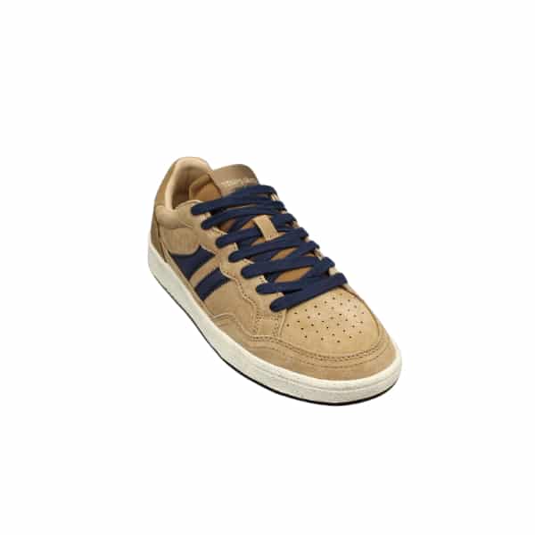 Zapato de hombre estilo casual TEDDY SMITH con cordones. Fabricada en un suave serraje color camel con bandas azules. Suela de goma color caramelo antideslizante.