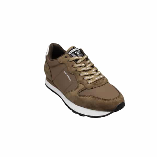 Zapato de hombre estilo casual TEDDY SMITH con cordones. Fabricado en serraje sintético combinado con nylon color marrón. Suela combi con pieza blanca en el talón.