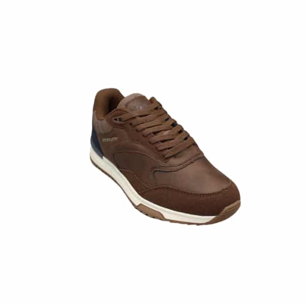 Zapato de hombre de DUNLOP con cordones. Fabricado en napa sintética color marrón con pieza azul en el talón. Suela de goma para mayor comodidad.