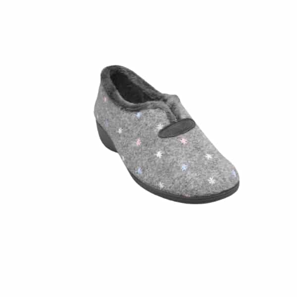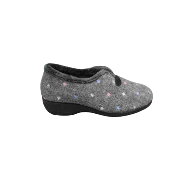 Zapatilla de casa de mujer abotinada con apertura en el empeine y ribete. Fabricado en tejido gris con bordados. Suela de goma con una ligera cuña para mayor comodidad.