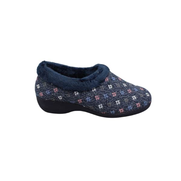 Zapatilla de casa de mujer abotinada. Fabricado en tejido estampado marino con ribete ancho en suapel. Ligera cuña de goma para mayor comodidad.