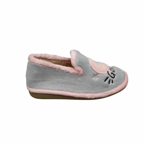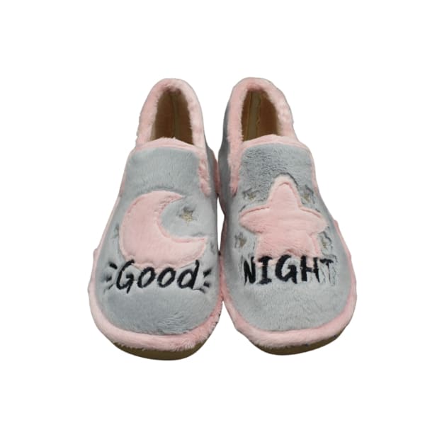Zapatilla de casa tipo twin con bordado luna y estrella. Fabricada en suapel gris con bordados y ribete rosa. Suela ligera y porosa que no deja huella.