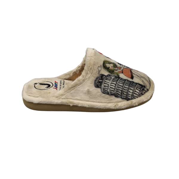 Chinela de casa de mujer tipo twin con estampado Torrre Pisa y bordado selfi. Fabricada en suapel color beige. Suela ligera y porosa que no deja huella.
