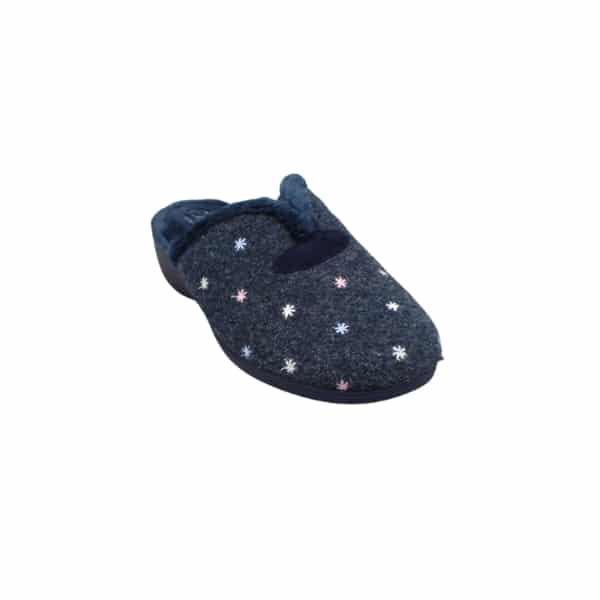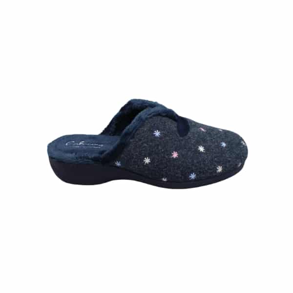 Chinela de casa de mujer con apertura en el empeine y ribete. Fabricado en tejido azul con bordados. Suela de goma con una ligera cuña para mayor comodidad.