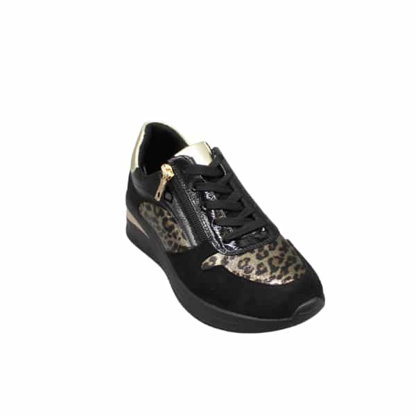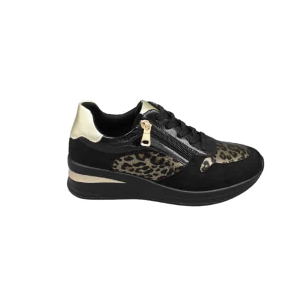 Zapato de mujer con cordones y cremallera lateral. Fabricado en material napa sintética negra combinado con animal print. Suela de cuña negra.