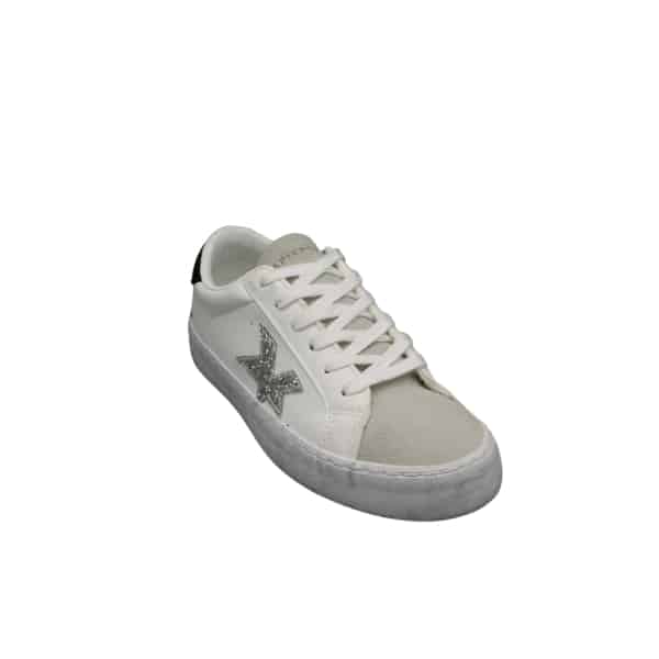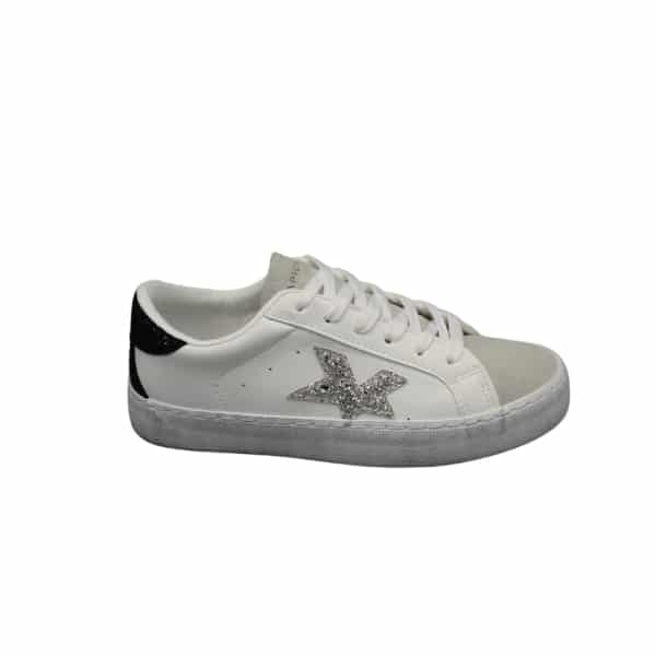 Zapato de mujer estilo deportivo con cordones y adorno plateado en el lateral. Fabricado en napa sintética color blanco combinado con suede en la puntera.