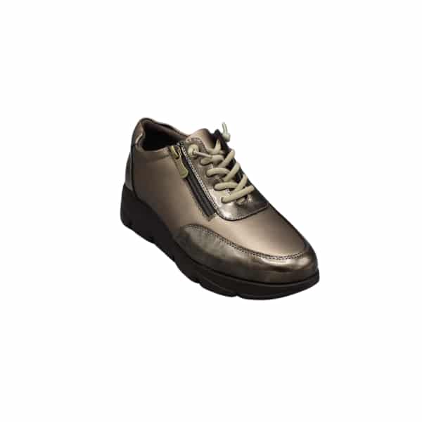 Zapato de mujer con cordones y cremallera lateral. Fabricado en piel color champagne con pieza en el talón y en la puntera. Suela con una pequeña cuña para mas comodidad.