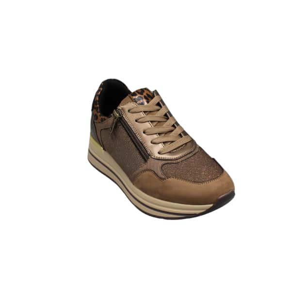 Zapato de mujer con cordones y cremallera lateral. Fabricado en material napa sintética combinado con tejido color marrón y pieza animal print en el talón.