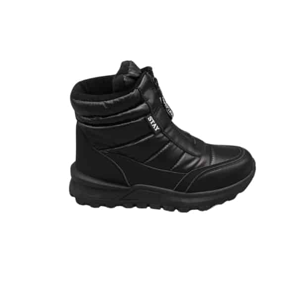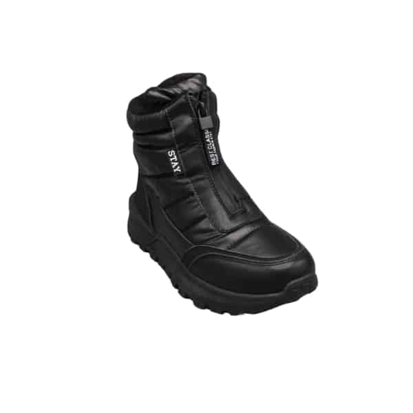 Botín de mujer estilo deportivo con cremallera delantera. Fabricado en napa sintética con tejido acolchado color negro. Suela de goma negra.