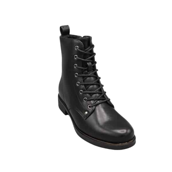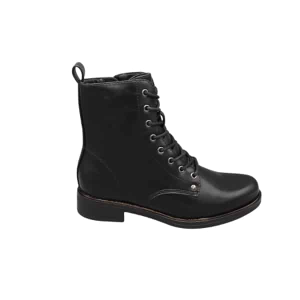 Botín de mujer con cordones y cremallera lateral. Fabricado en napa sintética color negro. Suela de goma con vira.