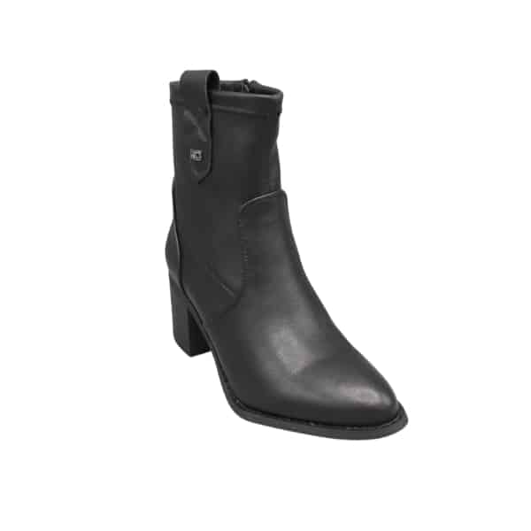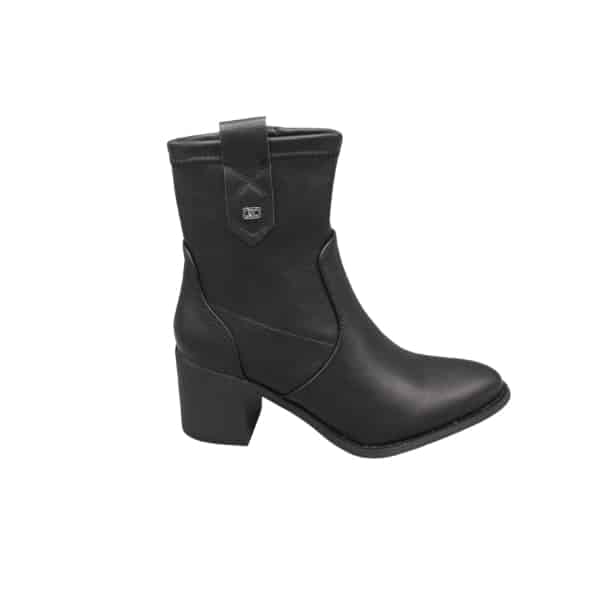 Botín de mujer con tacón bloque de media altura y costuras decorativas. Fabricado en napa sintética color negro con cremallera lateral.