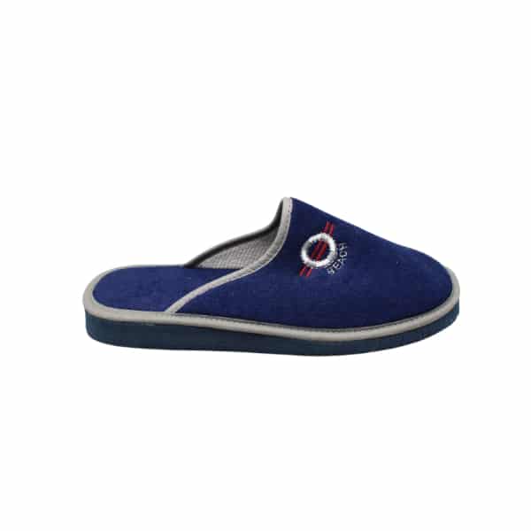 Zapatilla de casa de hombre abierta por detrás. Fabricado en tejido rizo color marino con ribete gris y bordado lateral. Suela ligera y confortable.