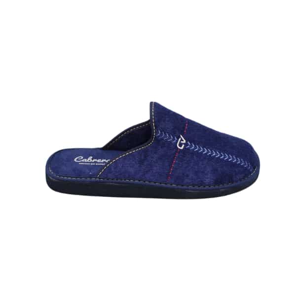 Zapatilla de casa de hombre abierta por detrás. Fabricado en toalla color marino con costuras y bordado lateral. Suela ligera y porosa que no deja huella.