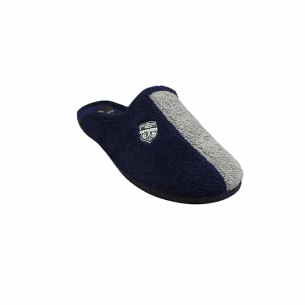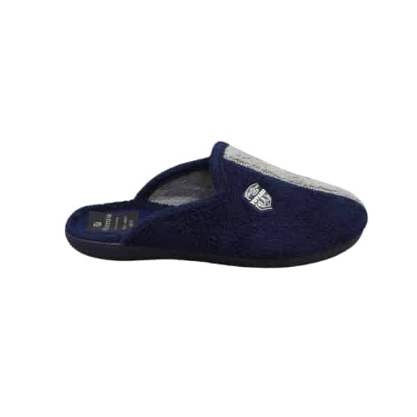 Zapatilla de casa de hombre abierta por detrás. Fabricada en rizo color marino y gris con escudo lateral. Suela de goma para mayor comodidad.