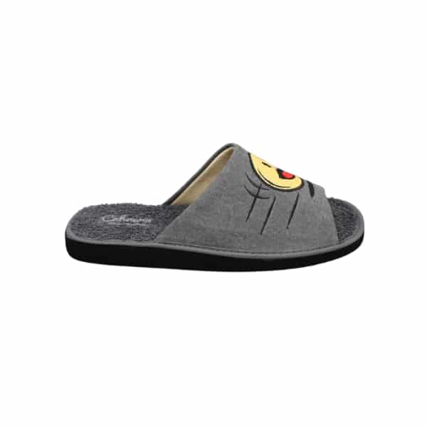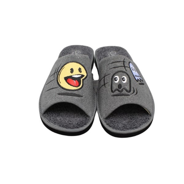 Zapatilla de casa de hombre abierta por delante y por detrás. Fabricado en tejido gris con bordado comecocos. Suela ligera y porosa que no deja huella.