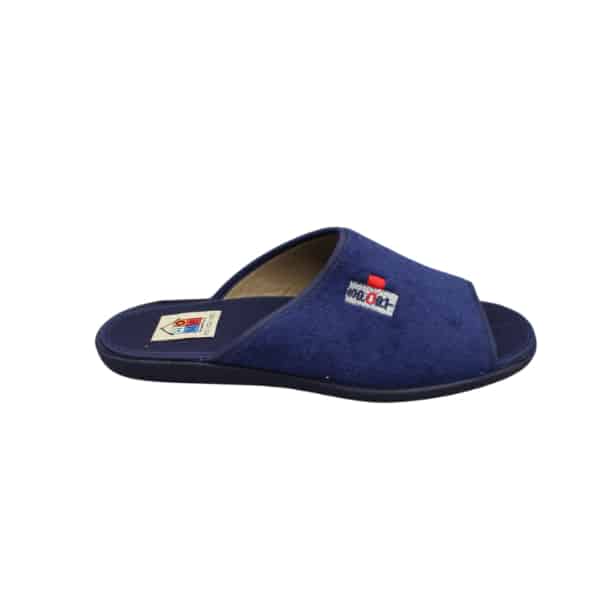 Zapatilla de casa de hombre abierta por delante y por detrás. Fabricada en rizo color marino y con bordado lateral sport. Suela de goma para mayor comodidad.