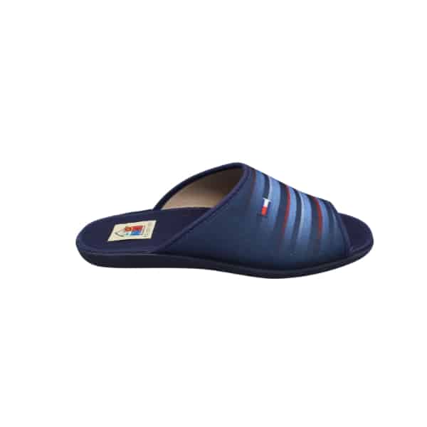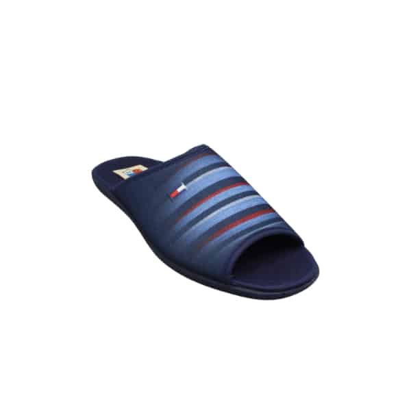 Zapatilla de casa de hombre abierta por delante y por detrás. Fabricada tejido color maino con rayas y bordado lateral. Suela de goma para mayor comodidad.
