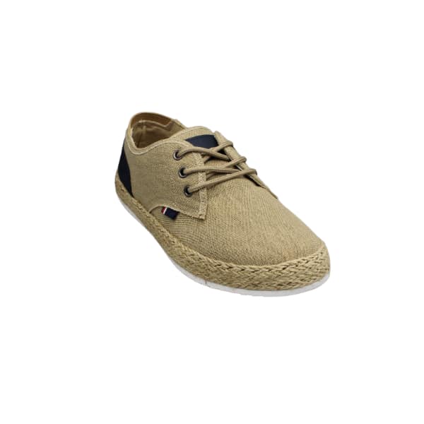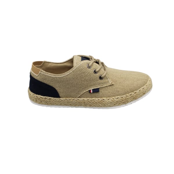 Alpargata de caballero con cordones. Fabricado en tejido color beige con un pequeño elástico en el talón para mejor calce. Suela con vira de yute.