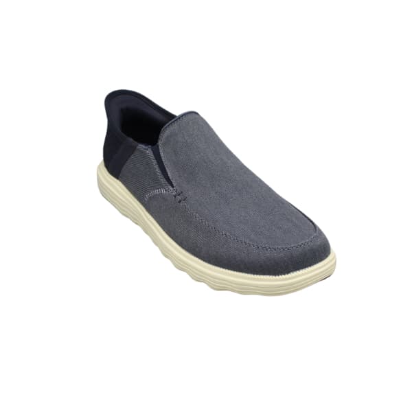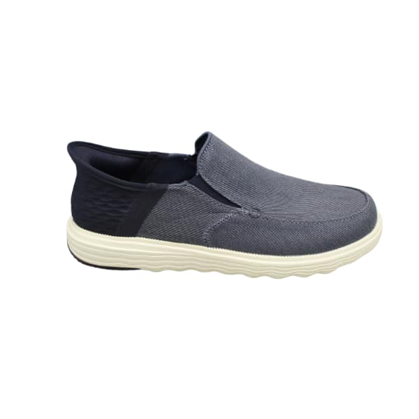 Zapato de caballero con elásticos. Fabricado en tejido color azul con refuerzo en el talón para mejor calce. Suela de goma para mayor comodidad.