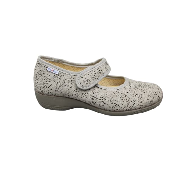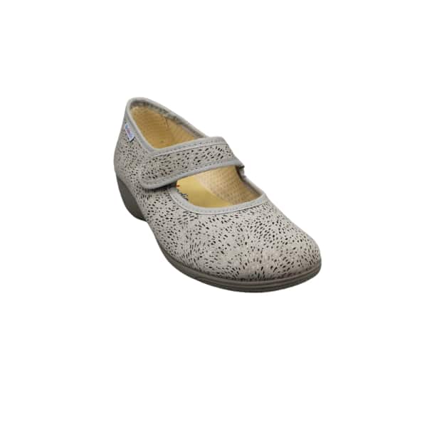 Zapato de mujer línea especial confort estilo mercedes con velcro. Fabricado en tejido estampado gris. Suela de goma y ligera cuña.