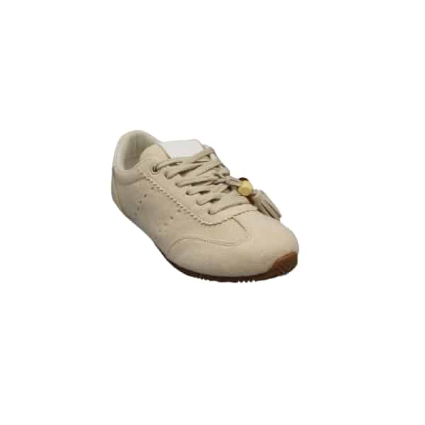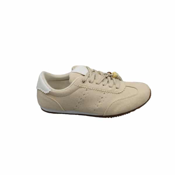 Zapato de mujer estilo deportivo con cordones. Fabricado en suede color beige con adornos de calados en los laterales. Suela de goma fina.