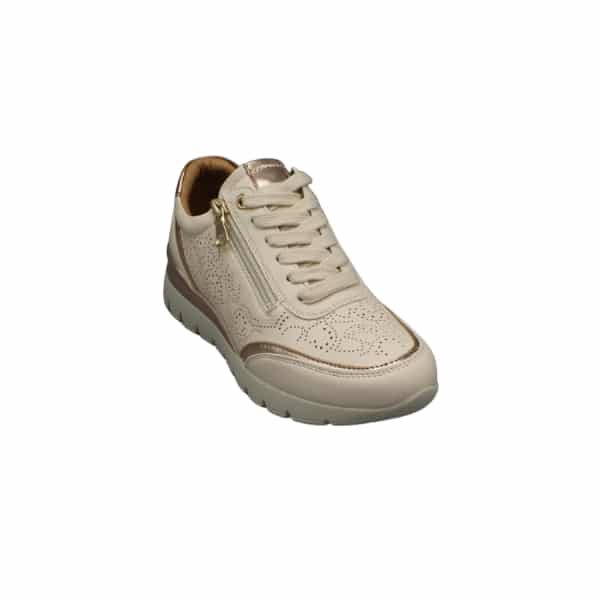Zapato de mujer con cordones y cremallera lateral. Fabricado en napa sintética color beige con picados. Suela con una pequeña cuña para mas comodidad.