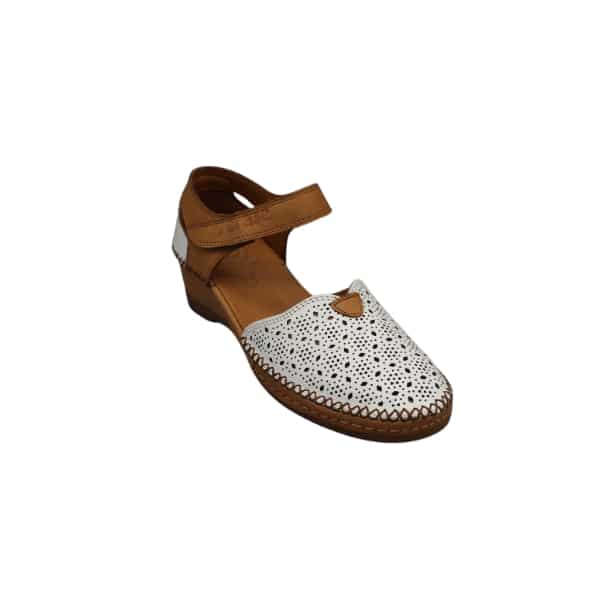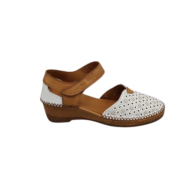Zapato de mujer abierto en los laterales con sistema de cierre de velcro en el tobillo. Fabricado en piel con picados color blanco combinado con camel. Suela con cuña forrada.