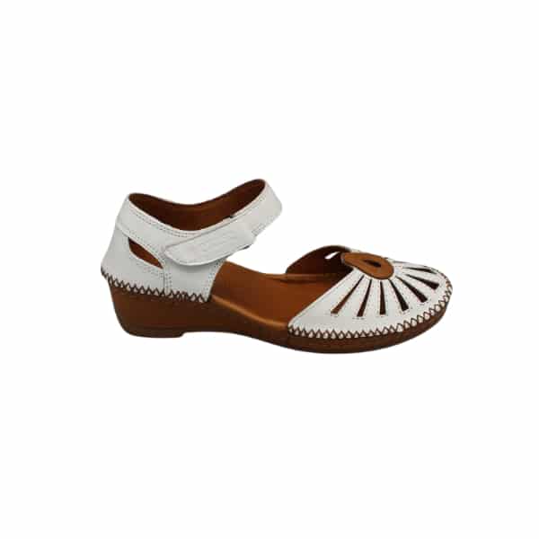 Zapato de mujer abierto en los laterales con sistema de cierre de velcro en el tobillo. Fabricado en piel color blanco combinado con camel. Suela con cuña forrada.