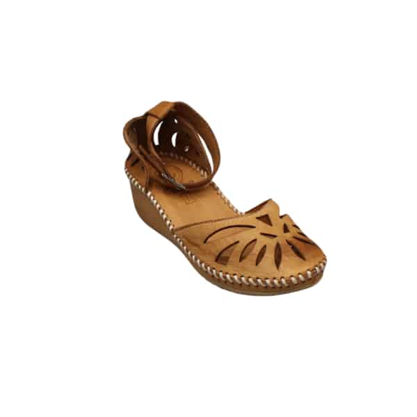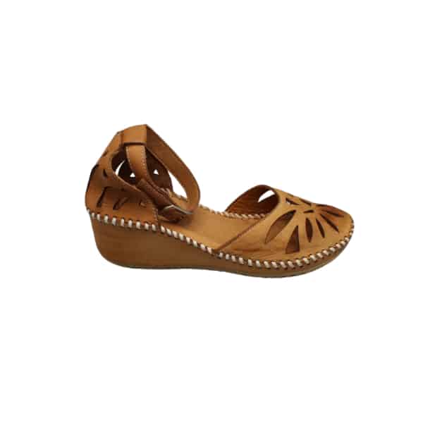 Zapato de mujer abierto en los laterales con sistema de cierre de velcro en el tobillo. Fabricado en piel con picados color camel. Suela con cuña forrada.