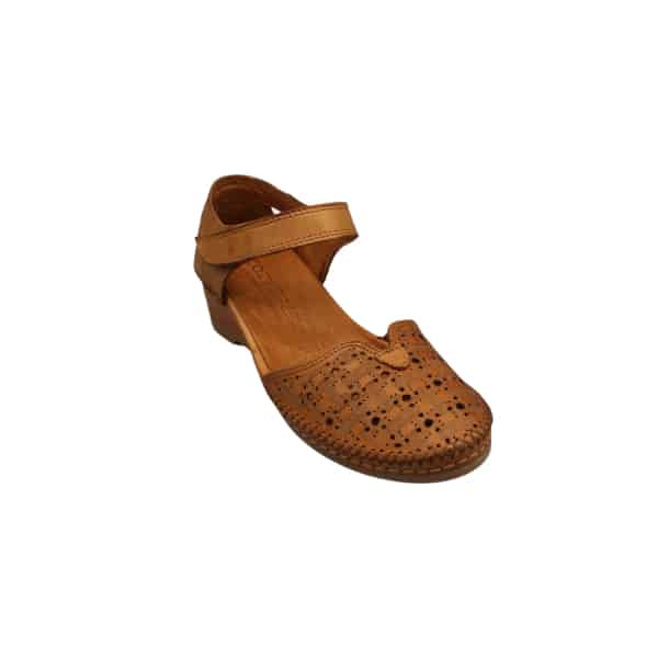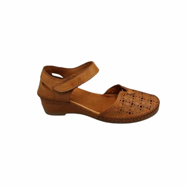 Zapato de mujer abierto en los laterales con sistema de cierre de velcro en el tobillo. Fabricado en piel con picados color camel. Suela con cuña forrada.