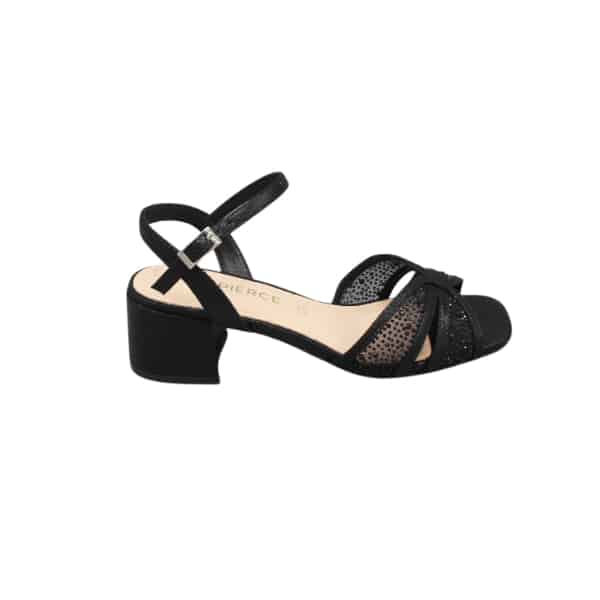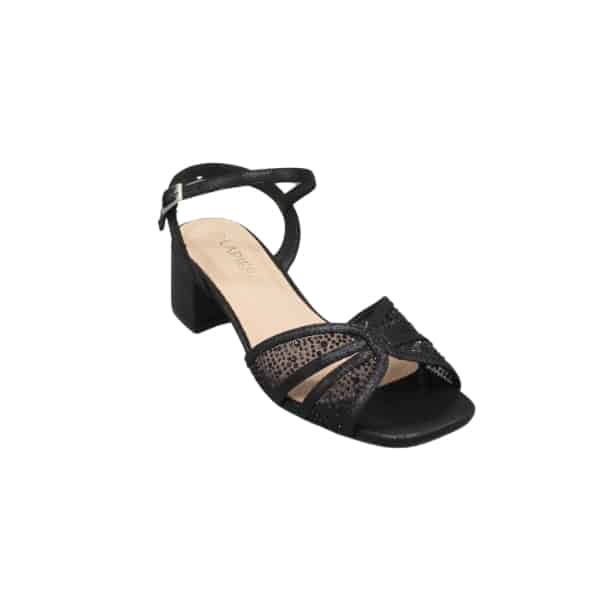 Sandalia de mujer con tiras cruzadas y tejido entre las tiras. Diseñada en material tejido con strass color negro y plantilla de piel, tacón bajo.