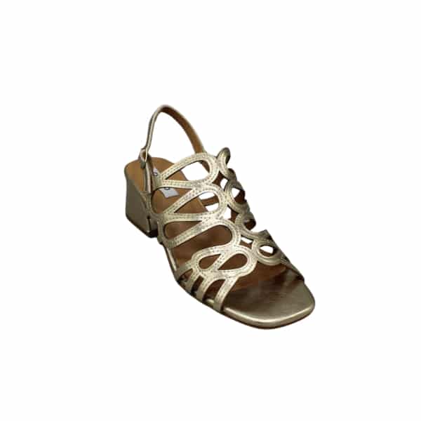 Sandalia de mujer con tiras entrelazadas y detalles metalizados con hebilla. Diseñada en material efecto piel color oro, con tacón bajo para mayor estabilidad y comodidad.